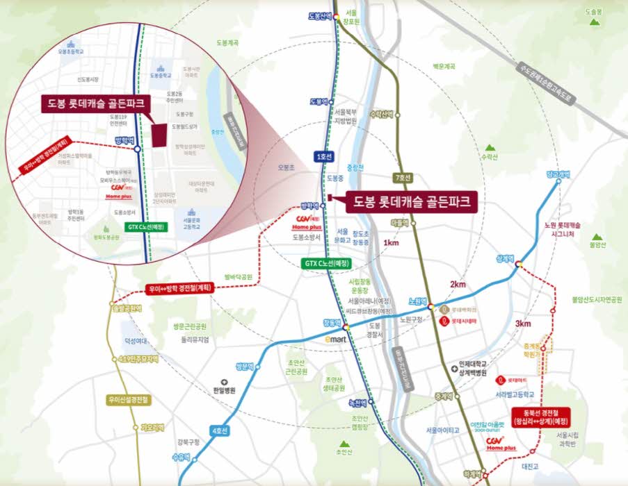 도봉 롯세캐슬 골든파크의 입지는 두말할필요없는 더블역세권 창동역 초역세권을 이용가능하며, 향후 GTX-C노선(예정)이 개통될 예정이라 최고의 교통 이슈가 있는 지역입니다. 학교또한 주변에서 가까우며 주변 대형마트와 극장, 중랑천 북한산등의 자연친화 특화되어있는 입지로 앞으로의 발전이 더 기돼가 되는 곳이라 하겠습니다.