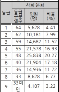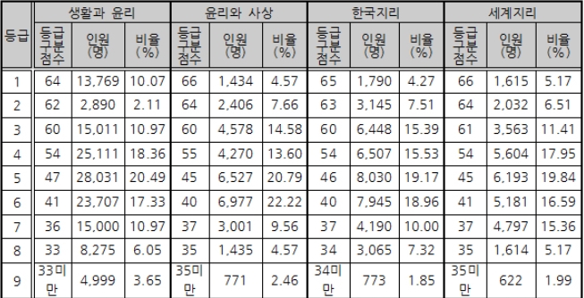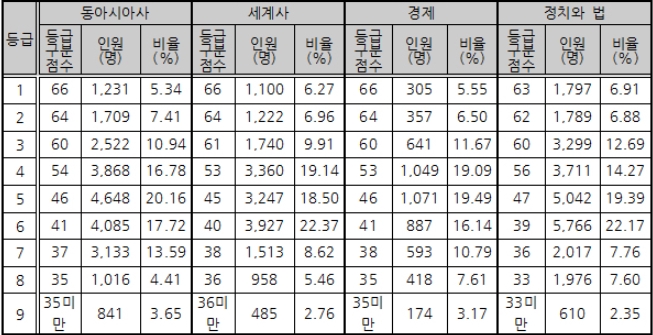 ㅇ 사탐 영역 등급 구분 표준점수, 등급별 인원 및 비율