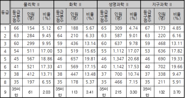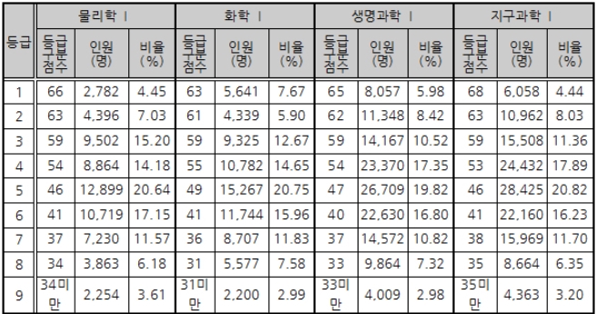 ㅇ 과탐 탐구 영역 등급 구분 표준점수, 등급별 인원 및 비율