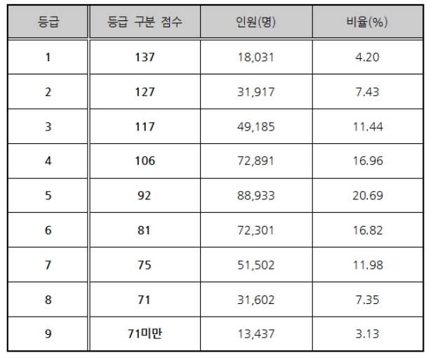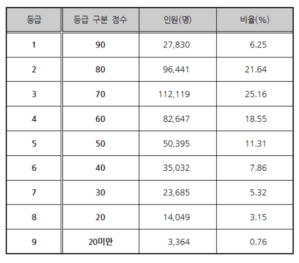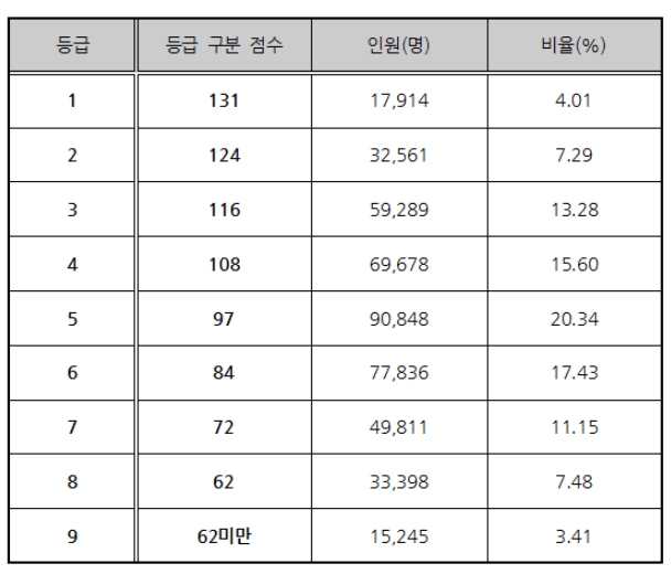 ㅇ국어 영역 등급 구분 표준점수, 등급별 인원 및 비율