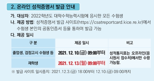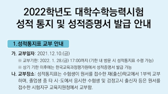 | 졸업생, 검정고시 수험생등 | 2021.12.10(금) 09:00부터 | 성적통지표는 오프라인(응시원서 접수처)에서만 수령 가능 |