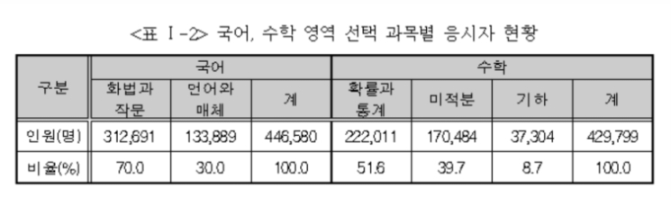 - 수학 : 확률과 통계 51.6%, 미적분 39.7%, 기하 8.7%