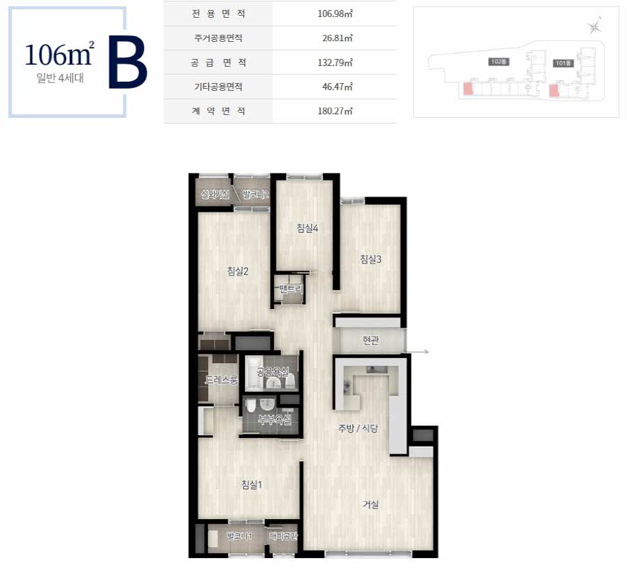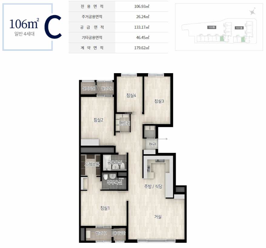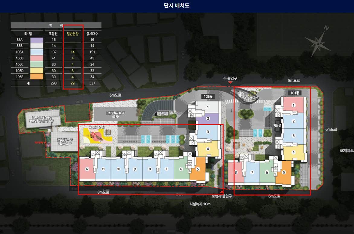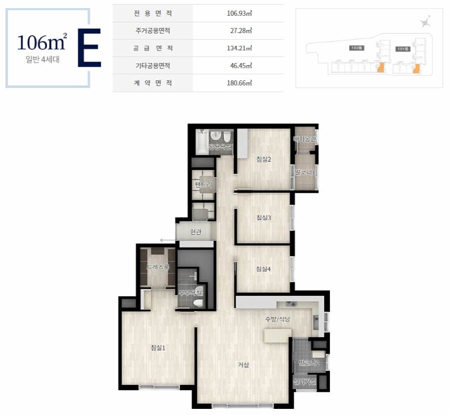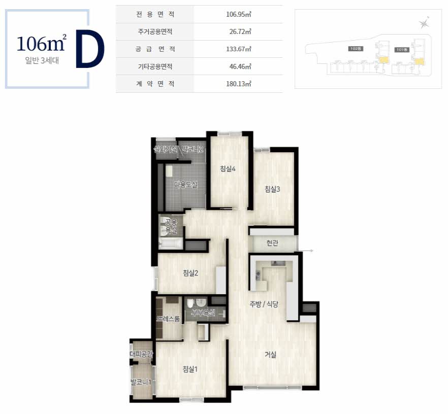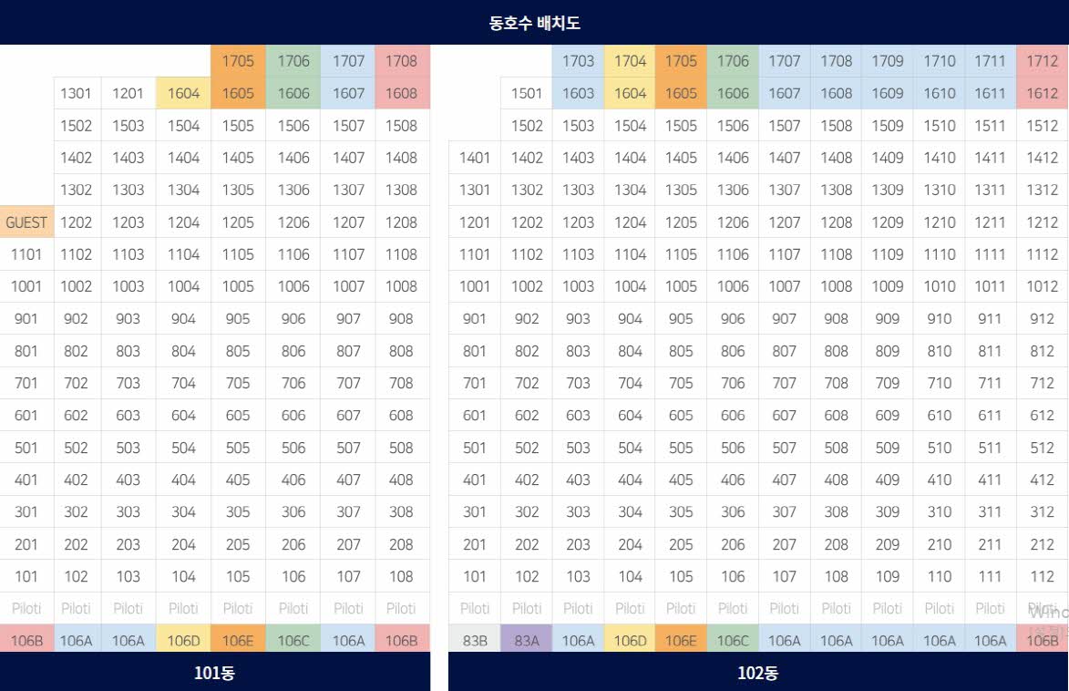 - 106A타입 : 14세대, 106B타입 : 4세대, 106C타입 : 4세대, 106D타입 : 3세대. 106E타입 : 4세대