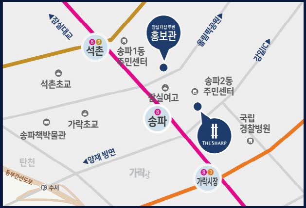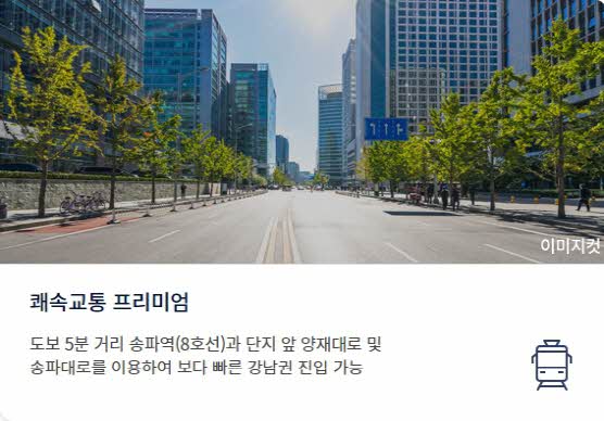 ㅇ 쾌속교통 프리미엄 : 도보 5분거리 송파역(8호선)과 단지 앞 양재대로 / 송파대로 이용시 강남진입 용이