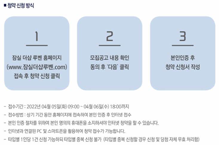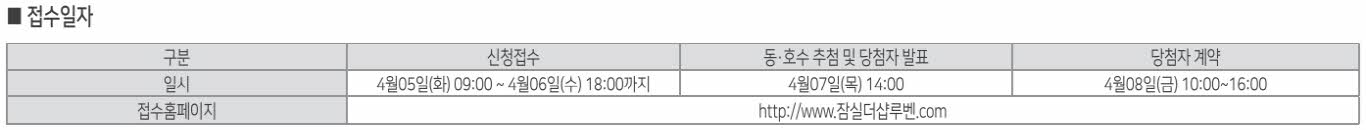 ㅇ 청약 신청 : 잠실 더샵 루벤 홈페이지 신청 04.05(화) ~ 04.06(수), 매일 09:00 ~ 18:00까지