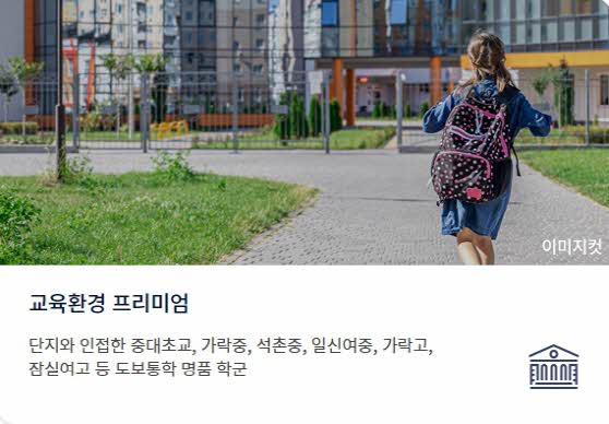 ㅇ 교육환경 프리미엄 : 단지와 인접한 초 중 고 도보통학 가능