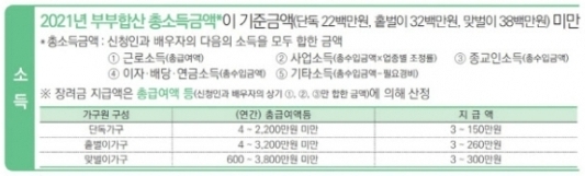 - 맞벌이 가구 : 신청인과 배우자(총 급여액 300만원 이상) 각각의 총급여액 등이 300만원 이상인 가구