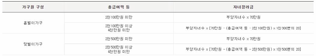 전년도 연간 부부합산 총급여액 등을 기준으로 다음의 산식을 반영한 자녀장려금 산정표에 따라 계산.
