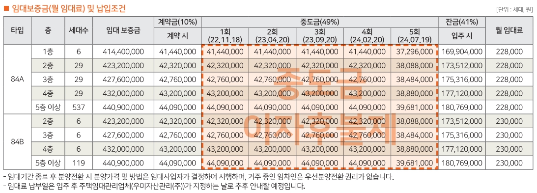 ㅇ 84A : 보증금 4억 1,440만~4억 4,090만, 월 임대료 22.8만원 별도