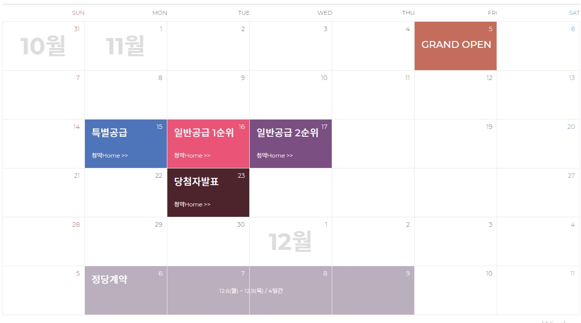 - 11.15일 특별공급, 11.16일 일반공급 1순위(당해, 기타), 11.17일 일반공급 2순위