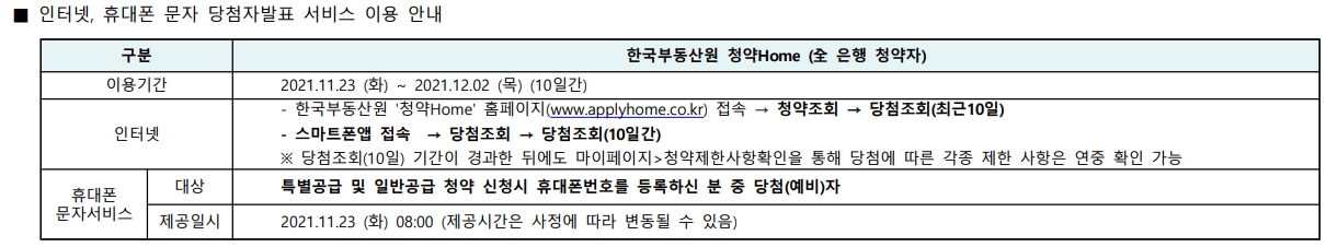 ㅇ 당첨자 발표 : 11.23(화), (당첨자발표 조회는 청약 홈에서 개별 조회)