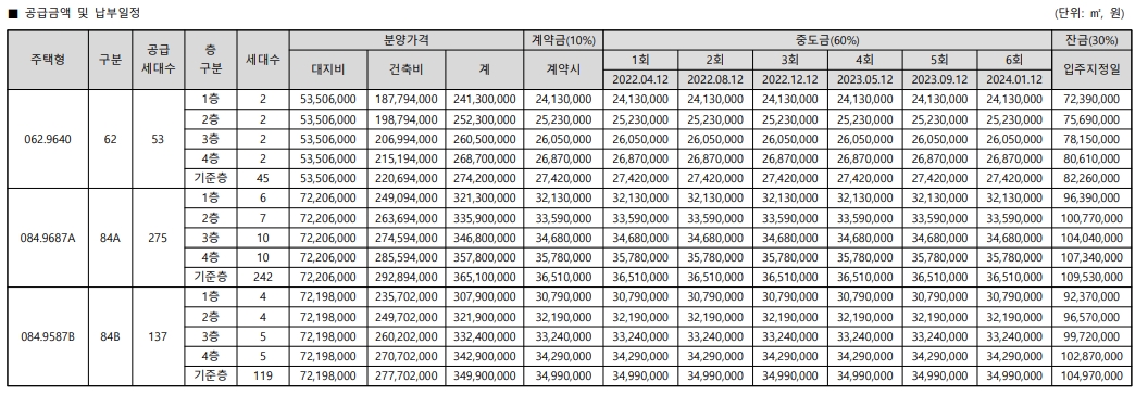 - 62타입 분양가(53세대) : 2억 4,130만~2억 7,420만 원